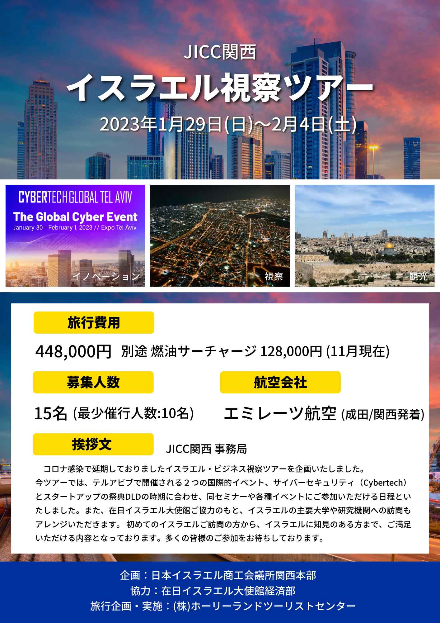 この度、コロナ感染の影響で延期しておりましたイスラエル・ビジネス視察ツアーを以下の要領で企画いたしました。 今ツアーでは、テルアビブで開催される2つの国際的イベント、サイバーセキュリティ(Cybertech)とスタートアップの祭典DLDの時期に合わせ、同セミナーや各種イベントにご参加いただける日程といたしました。 また、在日イスラエル大使館ご協力のもと、イスラエルの主要大学や研究機関への訪問もアレンジいただきます。 初めてのイスラエルご訪問の方から、イスラエルに知見のある方まで、ご満足いただける内容となっております。 多くの皆様のご参加をお待ちしております。